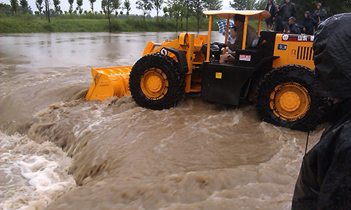 银泽小霸王立即投入到抗洪救灾之中,主要负责物资的运输、修复受损路段,以及铲装砂石料装入运输车辆等工作。在大坡度的防洪大堤面前、面对着涛涛江水,装载机没有打怵、机手更没有害怕;银泽小霸王将一条条装满砂石的防洪编织袋投入滚滚的江水之中,成为抗洪抢险中的金刚!