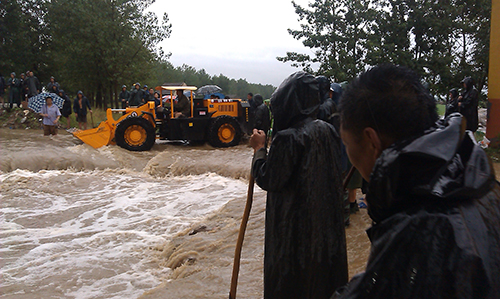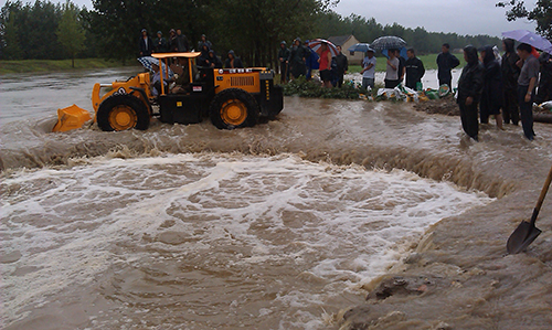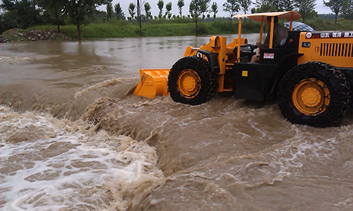 银泽小霸王立即投入到抗洪救灾之中,主要负责物资的运输、修复受损路段,以及铲装砂石料装入运输车辆等工作。在大坡度的防洪大堤面前、面对着涛涛江水,装载机没有打怵、机手更没有害怕;银泽小霸王将一条条装满砂石的防洪编织袋投入滚滚的江水之中,成为抗洪抢险中的金刚!